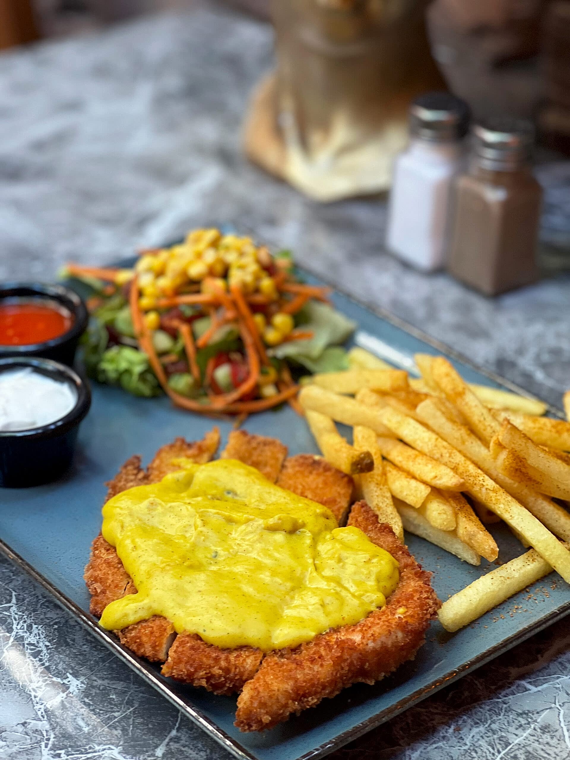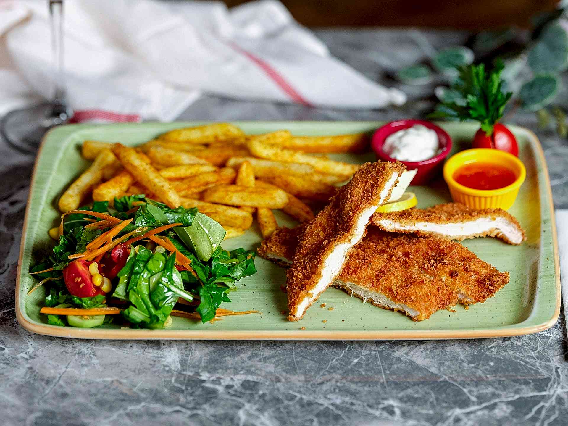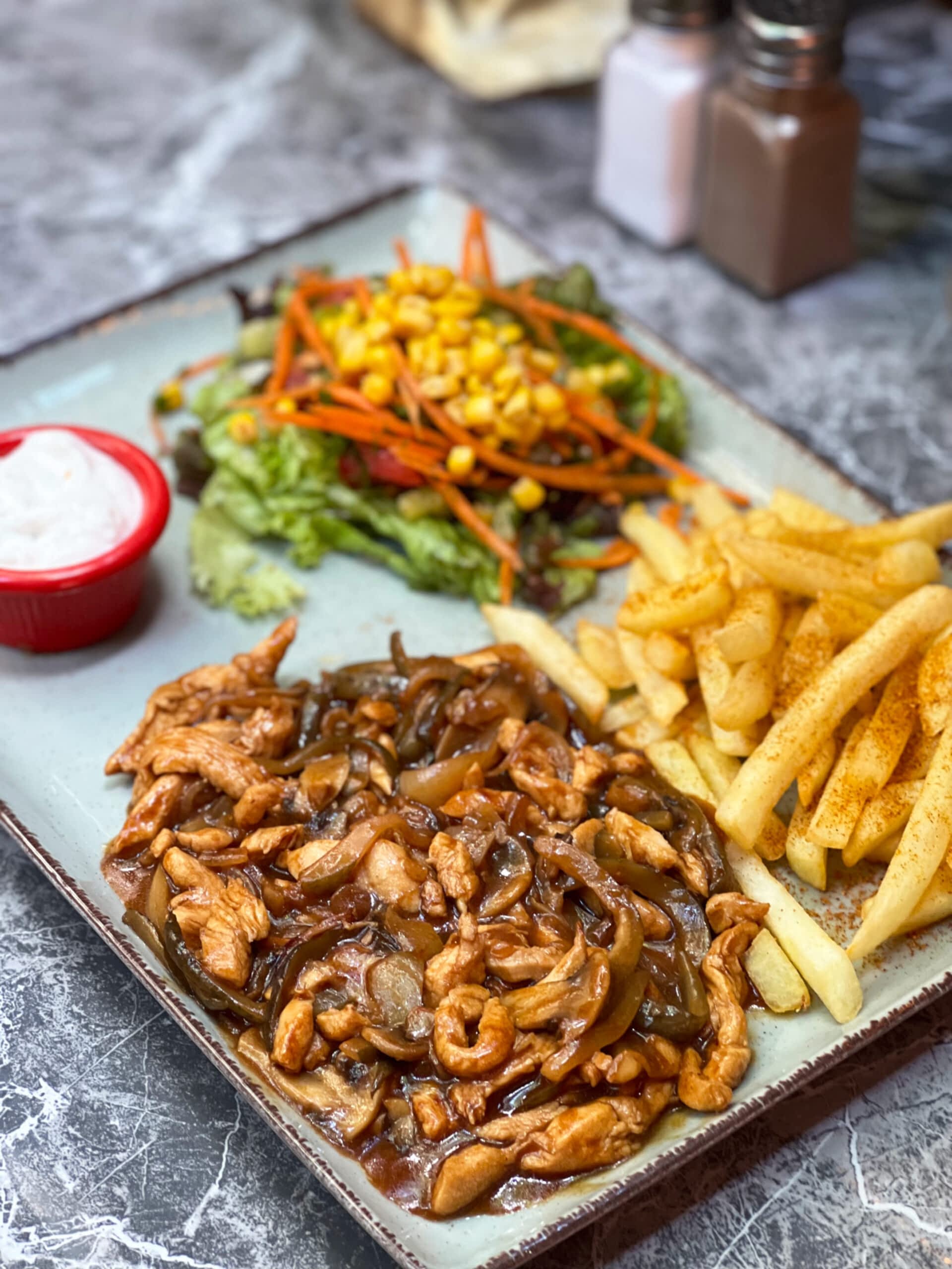 Ton Balığı, Domates, Turşu, Köz Biber, Mısır, Deep Sos, Patates