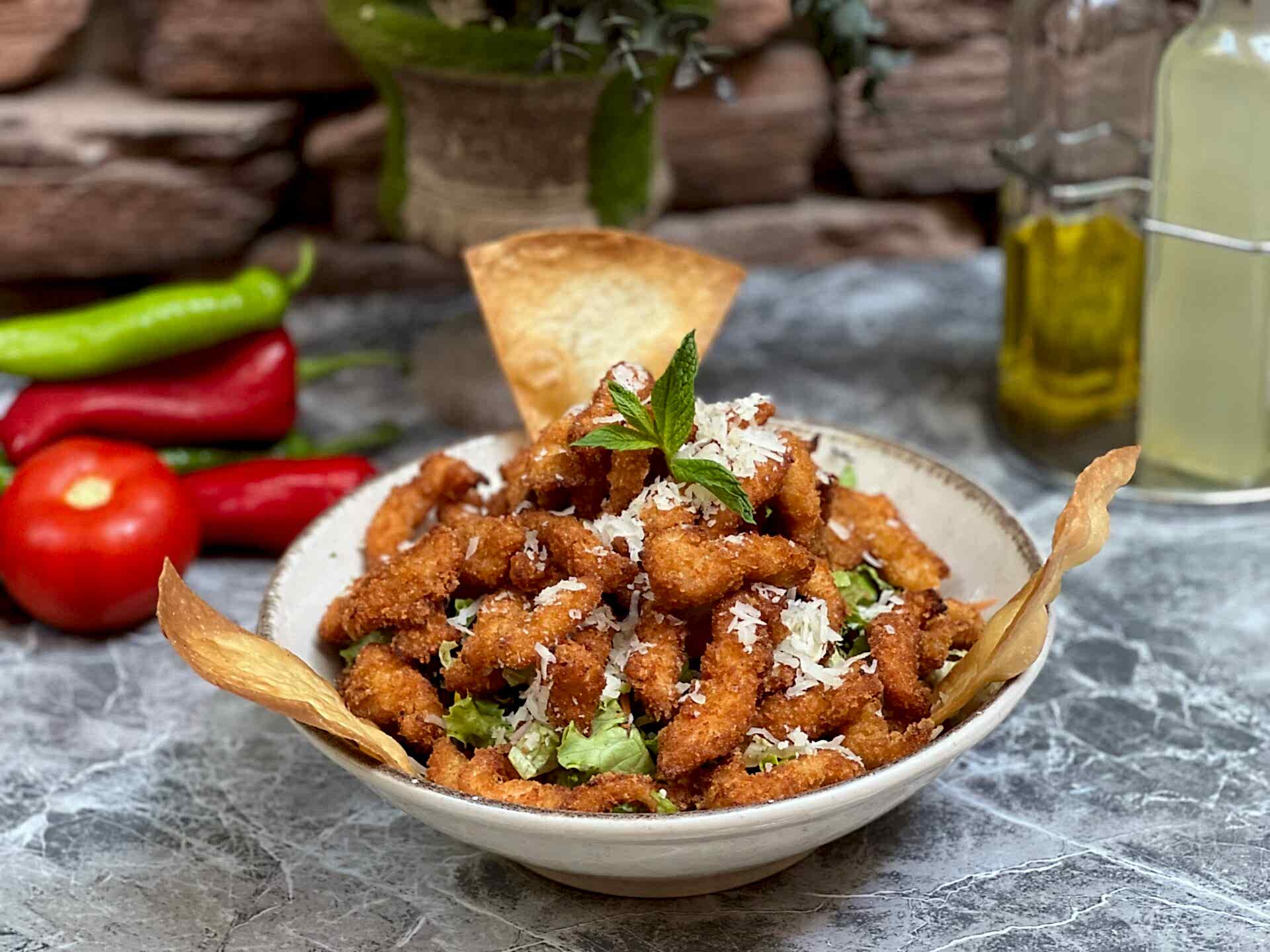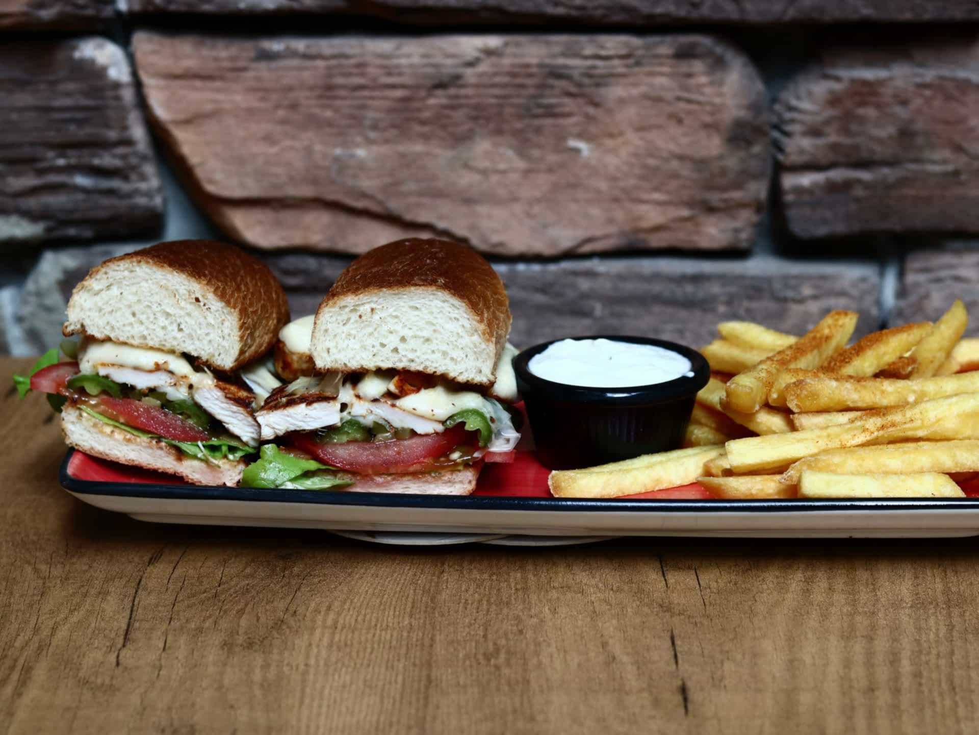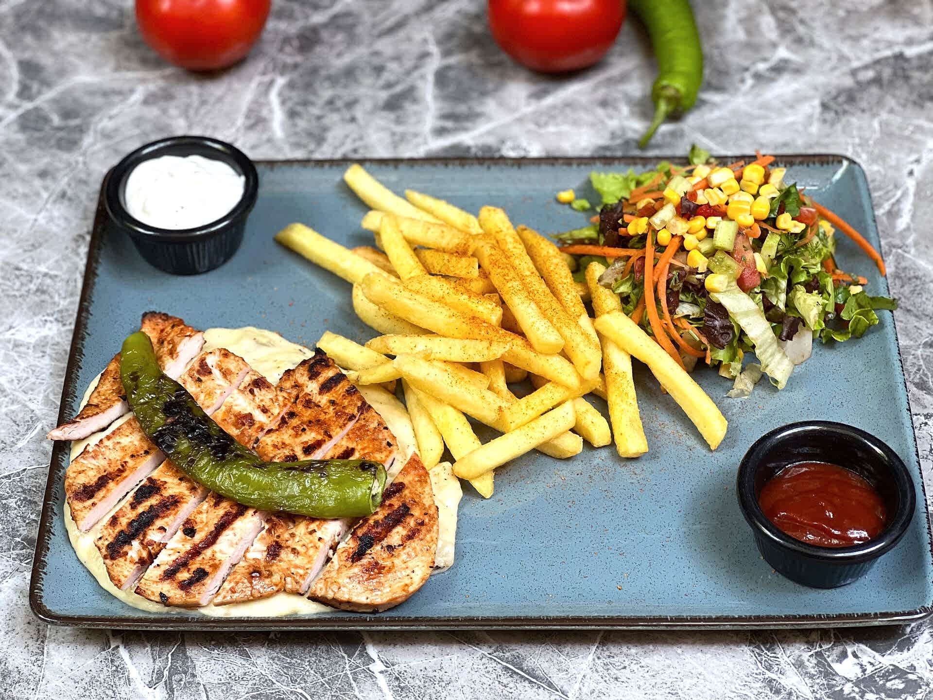 Izgara Tavuk, Kaşar, Köz Biber, Domates, Turşu, Deep Sos, Patates