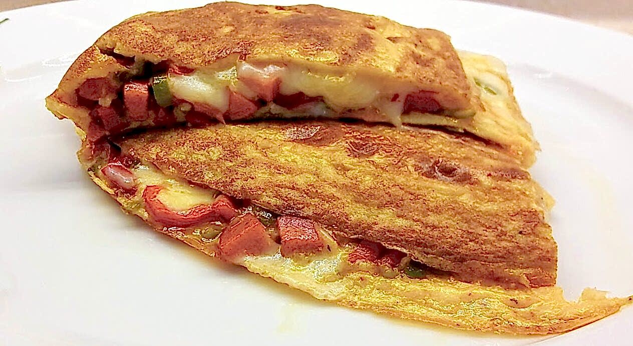 2 ADET YUMURTAN YAPILMIŞ KAŞAR PEYNİRİ,RENLİ BİBERLER,SUCUK VE MANTARLI OMLET YANINDA DOMATES VE SALATALIK